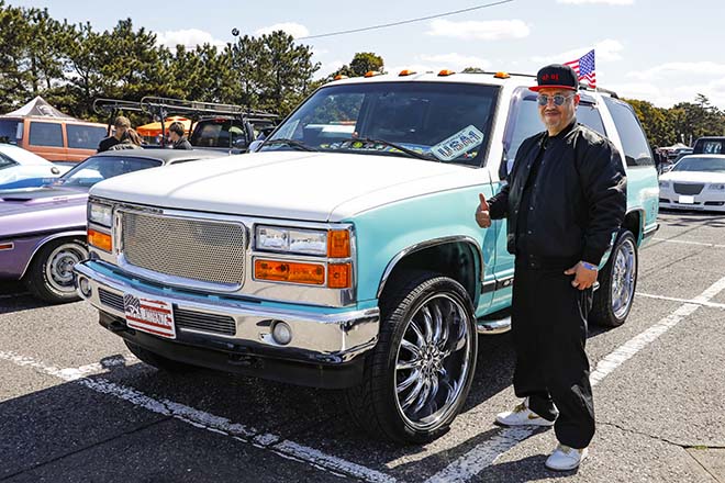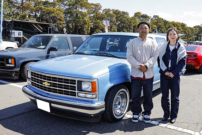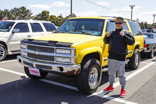 ティファニーブルーとホワイトのツートンカラーが西海岸をイメージさせるゴンさんのタホ。さらに24インチホイール& 2.5インチリフトを施し、GMCグリルをセット。90年代のアメ車が好きで、ボロボロの車両をコツコツ仕上げてここまできたそうだ。