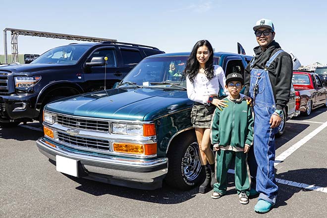 アームホルダーで腕を吊りながらも参加してくれたパパ。イベントまでに内装を仕上げて参加する予定もケガのために断念。外装は、モールなどのメッキ類を新調しながらコツコツ綺麗に仕上げているそうだ。なお最近タホも購入し、次回は奥様が運転して参加を予定。