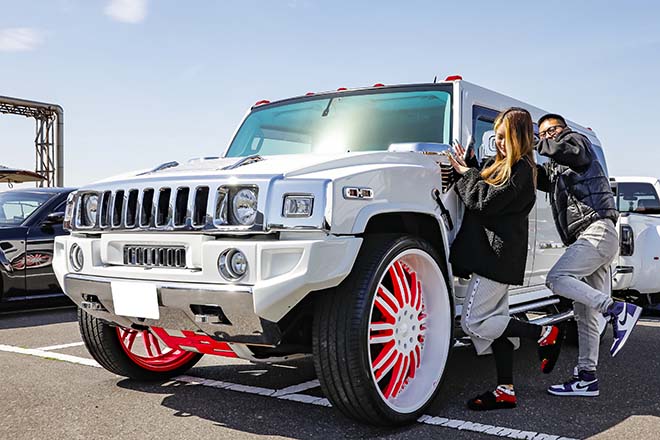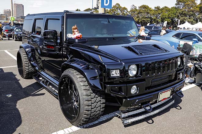 オーナーの代わりに登場したのは、ボンネットの上に置かれたお人形さん…。そんなH2は、ド級の太さを誇るハイフォージドの26×16Jホイール、装着を可能にしたワンオフ加工の足回り&ワンオフマフラーと見どころ十分。人形とのギャップがとてもクール(笑)