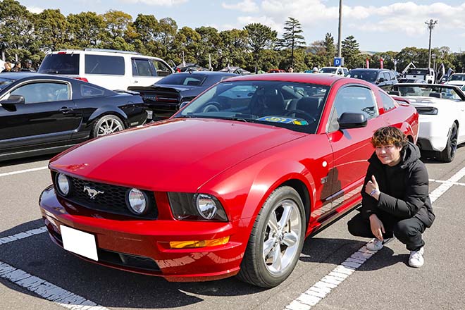 2ヶ月前、18才ながら初めての愛車として選んだ、ダークキャンディアップルレッドのマスタングGT。現在もしっかり若葉マークを貼り付け走行中!左上枠のてつべぇさんとは知り合いで、V8の面白さを叩き込まれV6は購入の選択肢から削除したようだ。
