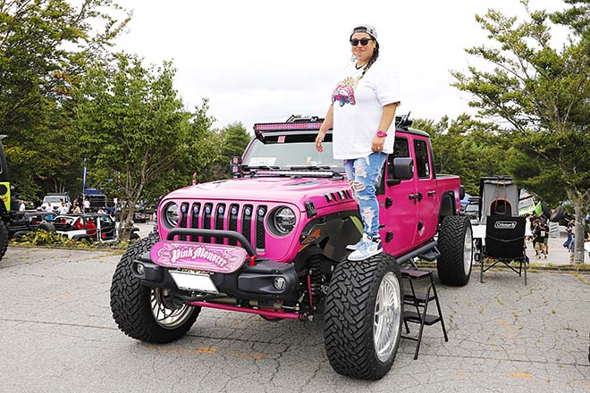 ド派手なピンクのグラディエーターは、ジープ界隈ではもはや有名人。6本出しマフラーも強烈なインパクト。これでスーパーの買い物にも行くそうだ。